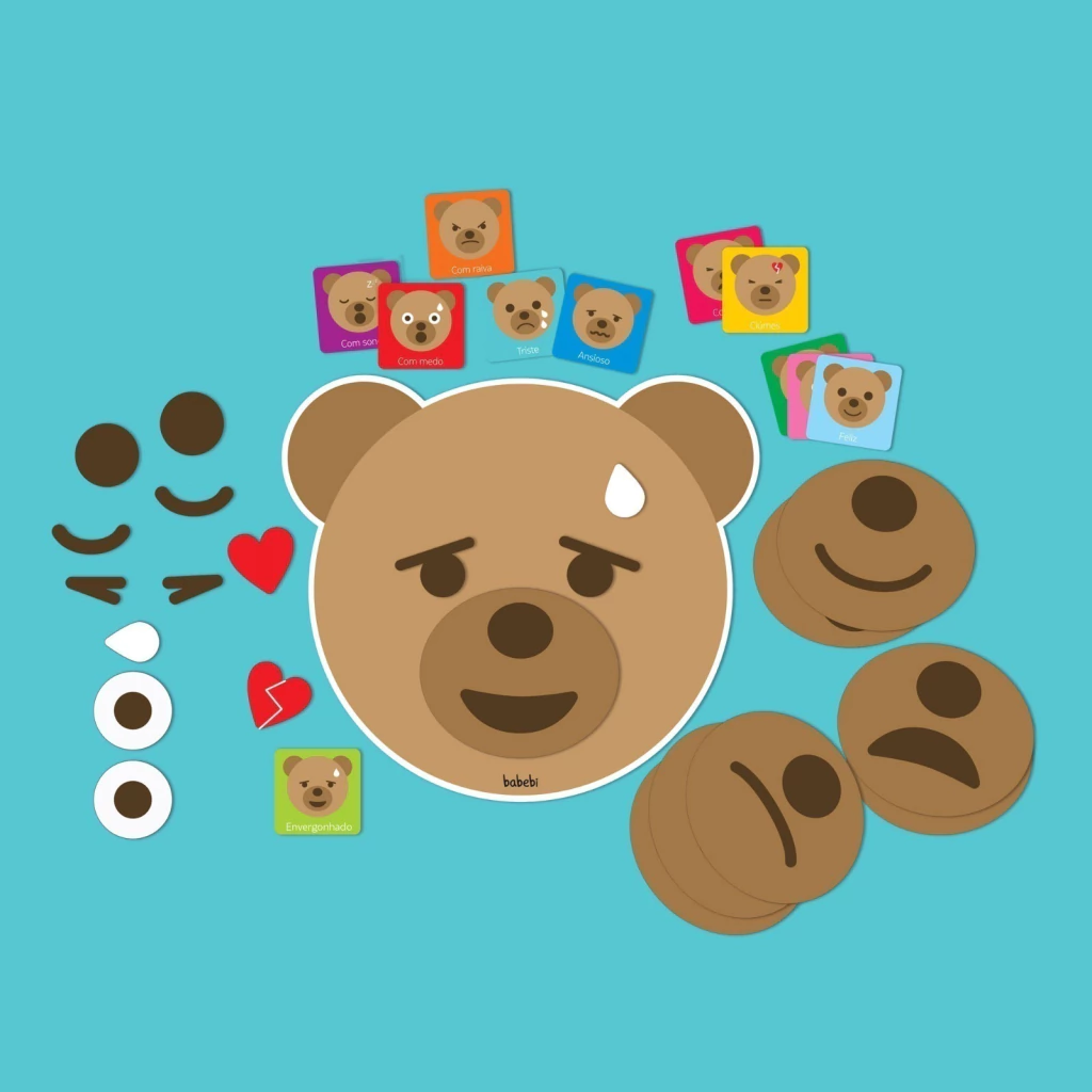 Contém 1 tabuleiro em formato de ursinho (26x23cm), 24 peças (expressões) e 12 fichas com sentimentos