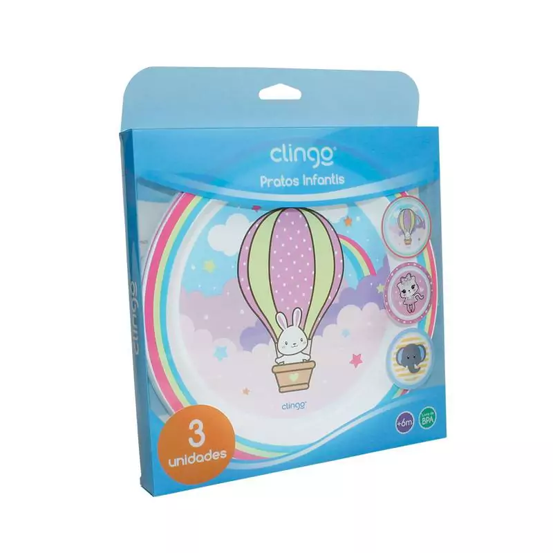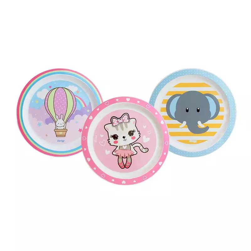 Kit 3 pratos rasos infantis com cores e estampas divertidas que tornam a refeição dos pequenos ainda mais divertida.