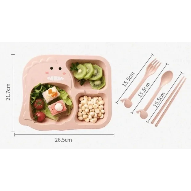 O kit é composto por um prato temático de dinossauro com 3 divisórias para separar bem a comida e talheres (colher, garfo e palitos).