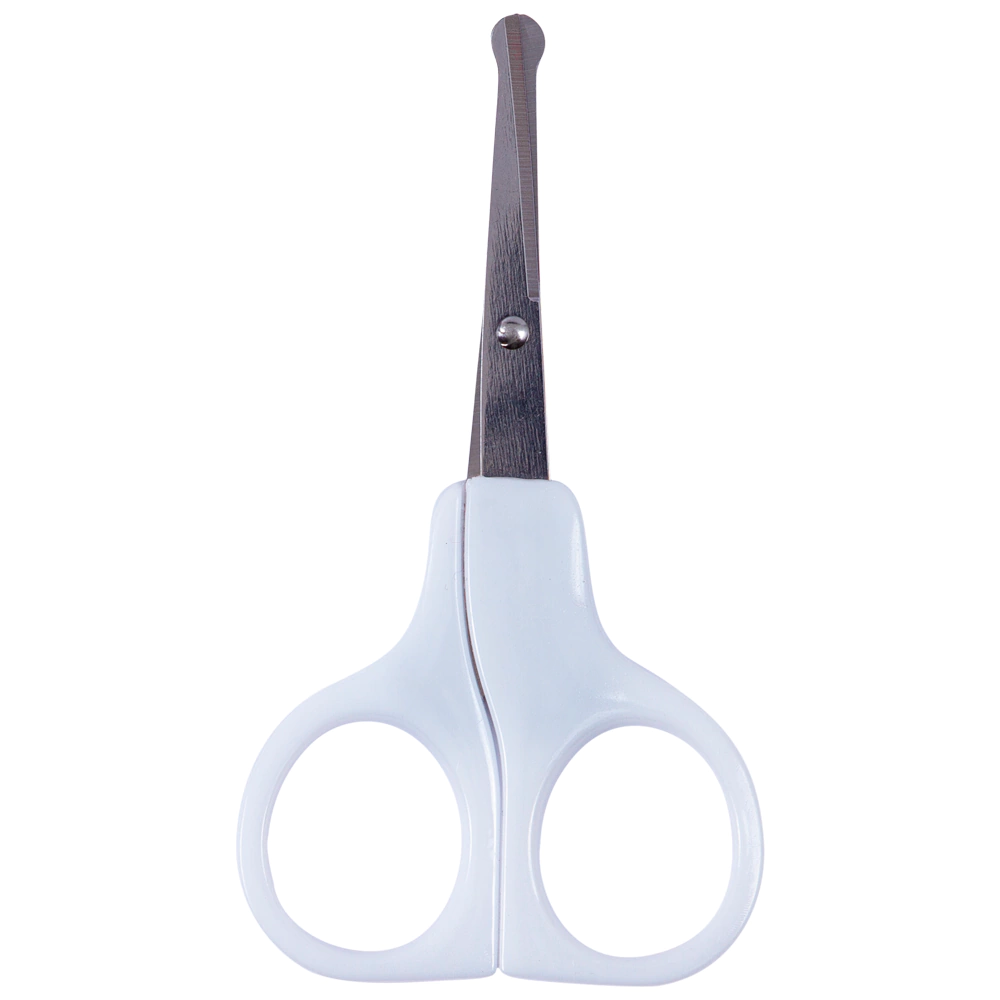 Possui tesoura, lixa e cortador de unhas. A tesoura tem as pontas arredondadas.
