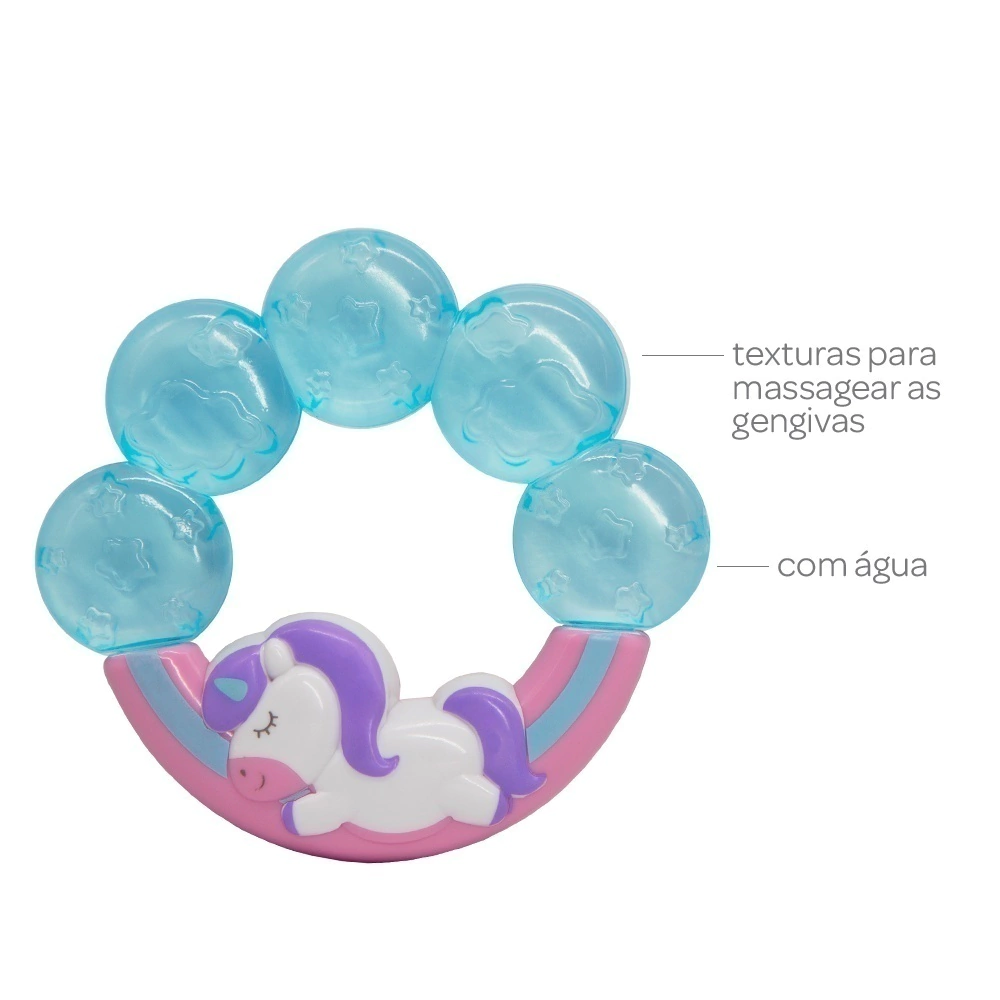 O interior do mordedor contém água. Ao ser resfriado na geladeira, o mordedor gelado proporciona uma sensação de alívio e frescor para o bebê.